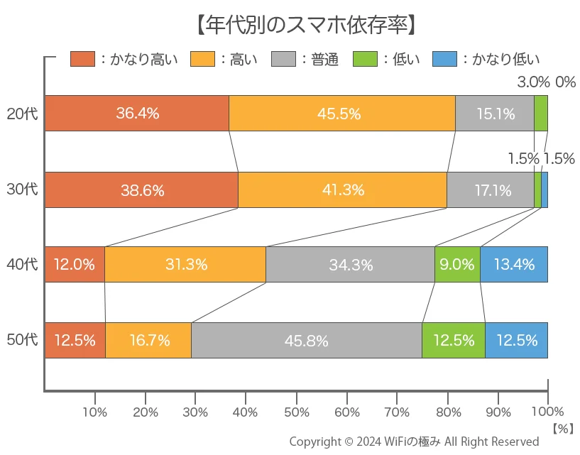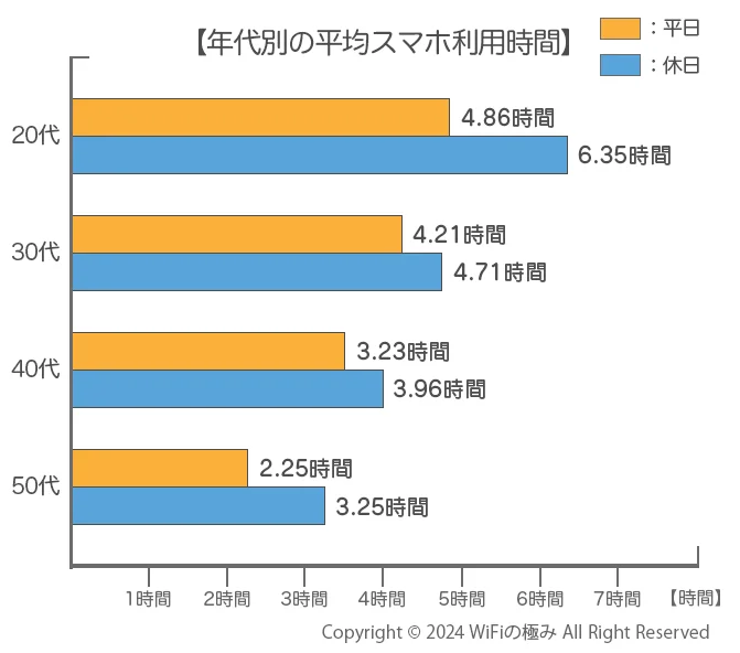 スマホの利用時間は平日で3.66時間、休日で4.36時間。特に休日の利用時間が長く、8時間以上を超える人も1割以上いるという結果でした。年代別に見ると、平均利用時間は20代が最も高く、年代が高くなるにつれて減っていく傾向となっています。